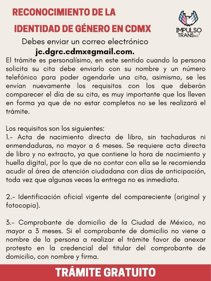 El cambio de identidad legal se realiza directamente en el registro civil sin necesidad de haber iniciado algún tratamiento hormonal y necesitas: